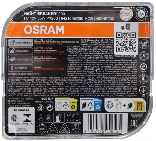 64210NB200-HCB Osram H7 12V 55W Night Breaker 200 Bulb +200% Brightness
