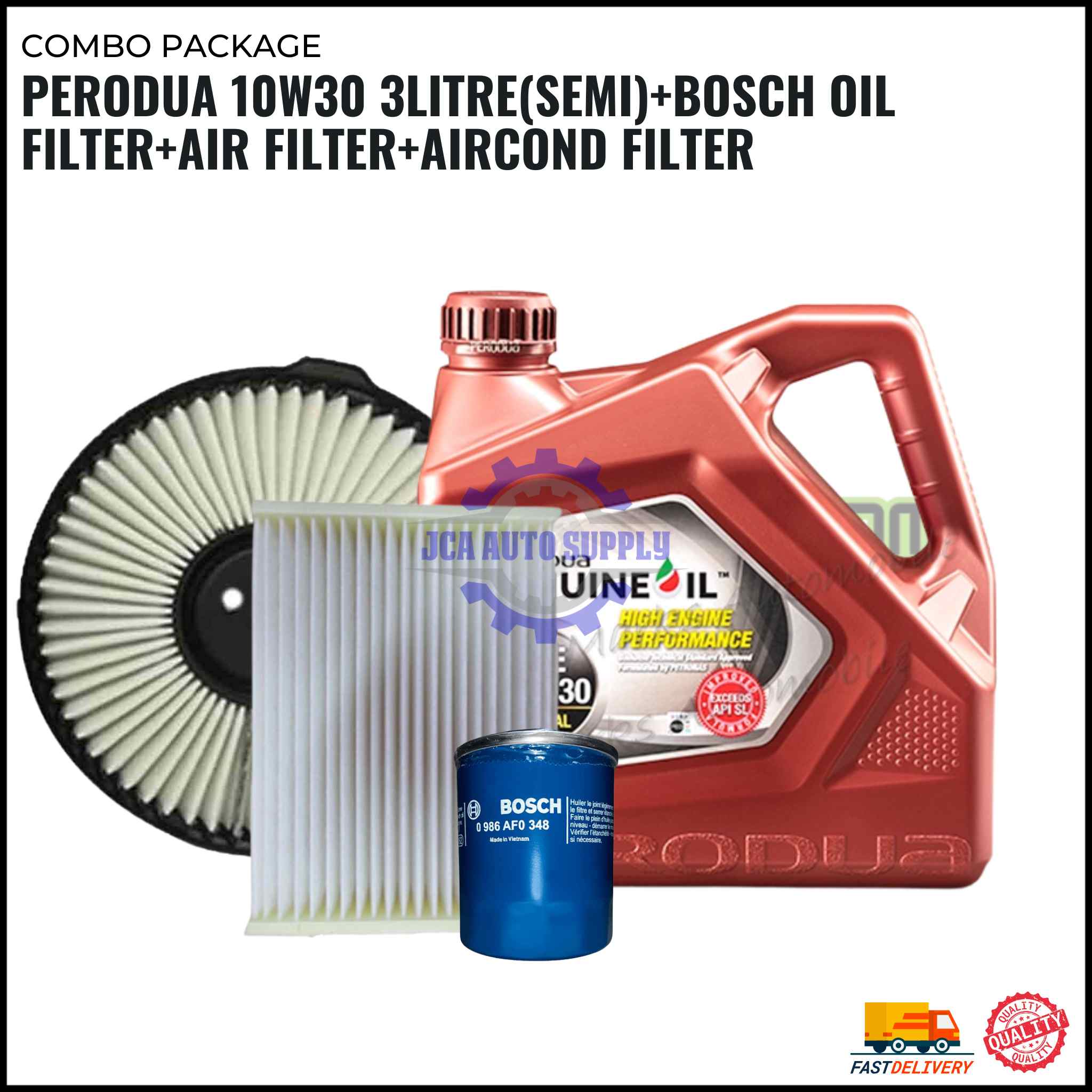 Contains : Perodua 10w30 3L+Bosch Oil Filter+Air Filter+Aircond Filter